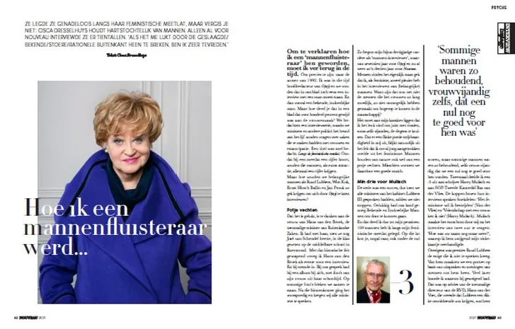 Als iemand weet hoe je mannen aan de praat moet krijgen, is het Cisca Dresselhuys wel – ze leverde zo al prachtige interviews voor Nouveau. In het jubileumnummer verklapt ze hoe ze een 'mannenfluisteraar' is geworden, al dan niet met gebruik van de feministische meetlat.