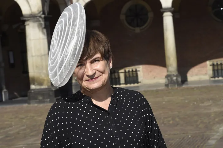 Minister Ank Bijleveld van Defensie had kans gezien een stemmig zwarte hoed te vinden die toch iets frivools had (en met een beetje fantasie kun je er een soort gevechtskoepel in zien).