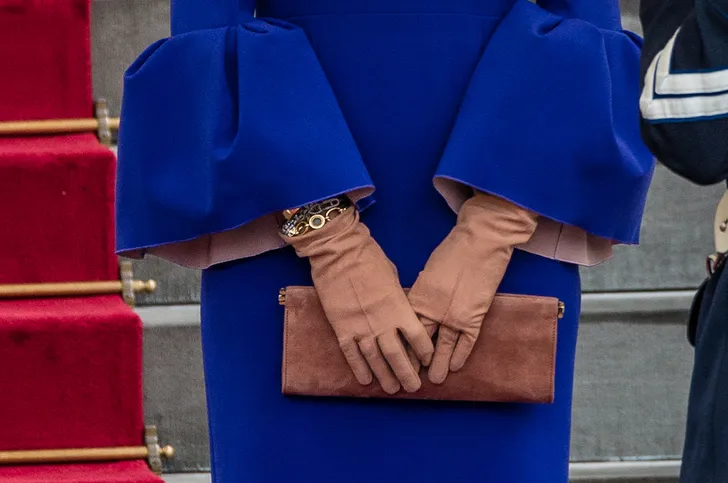 Eenmaal uit de auto, houdt een dame altijd haar tas voor zich en dat doet ze met beide handen - zoals Máxima hier laat zien. Je zult de koningin niet snel een clutch geklemd onder haar arm zien dragen of - helemaal not done - op de grond zien plaatsen tijdens een diner. In plaats daarvan wordt een tas vaak tussen de koninklijke rug en de rug van de stoel geplaatst tijdens het eten.
