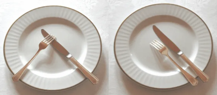 Ook als je een hap neemt. Je switcht je vork en mes nooit. En je eet van de achterkant, het bolle gedeelte, van je vork, daar 'schuif' je het eten op. Neem vervolgens drie happen, maximaal vier, daarna pauzeer je even. Ben je klaar met eten, leg dan je vork en mes diagonaal op je bord. Zie je bord als een klok: leg ze op '10 en 4 uur' (rechts). De afbeelding links geeft aan: ik pauzeer.