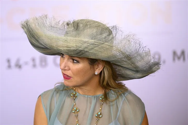Voor het huwelijk van prins Pieter Christiaan en prinses Anita droeg Máxima dit goddelijke wagenwiel van Fabienne Delvigne. Hij was zo breed dat Willem-Alexander de hele dienst een beetje schuin naar links moest hangen.