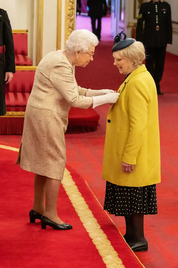 …en droeg de Queen voor het eerst handschoenen bij het uitreiken van een stel lintjes.