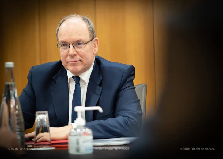 Zo staat bij prins Albert van Monaco de desinfecterende handgel op tafel…