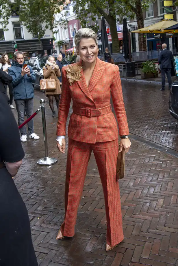 Koningin Máxima nam in oktober 2021 als erevoorzitter van Méér Muziek in de Klas op het Conservatorium van Utrecht deel aan een zangles bijeenkomst. Ze verscheen in een nat Utrecht, maar wél in een dijk van een najaar outfit: een fonkelnieuw oranje pak met een kleine pied-de-poule print. De strakke paardenstaart en fijne bloem maken het helemaal af. Designer: Natan, uiteraard.