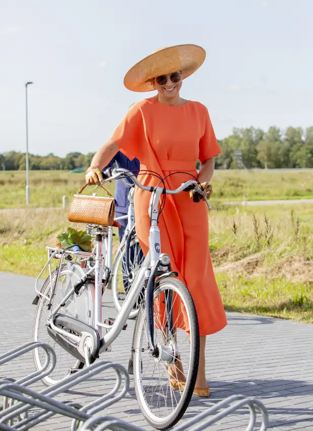 In september 2020 bracht ons koninklijk paar een streekbezoekje aan Zuidoost-Fryslân. En dat ging op z'n uber-Hollands, namelijk op de fiets. Hare Majesteit droeg destijds een beeldige nieuwe Natan-japon en een breedgerande relevé van Fabienne Delvigne.