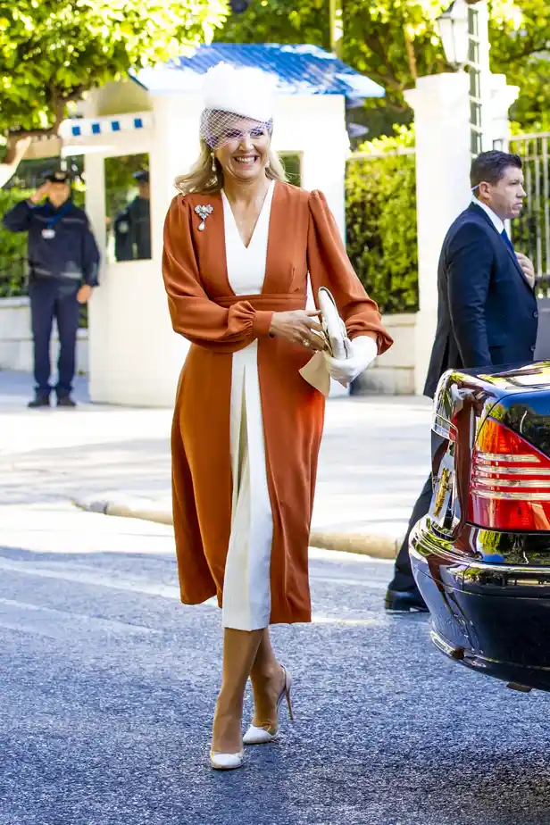 Tijdens een staatsbezoek aan Griekenland in oktober 2022, kon een bezoekje aan de Akropolis natuurlijk niet uitblijven. Het koninklijk paar kreeg een uitgebreide rondleiding met uitleg van een archeoloog. Máxima kleedde zich voor de gelegenheid als een heuse Griekse godin en trok een oranje ontwerp van het Griekse label Zeus + Dione uit haar koffer. De A-lijn jurk is getailleerd en de rok loopt wijd uit. Beeldig, als je het ons vraagt.