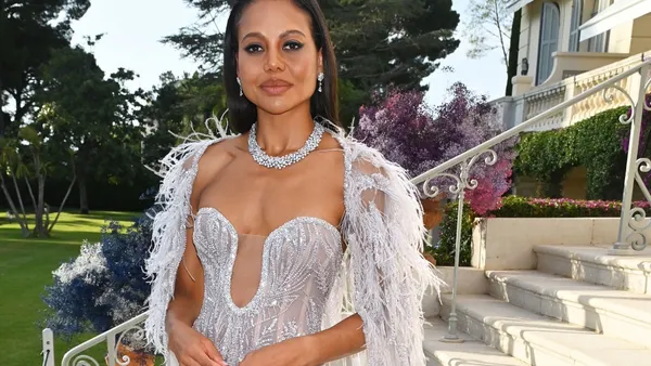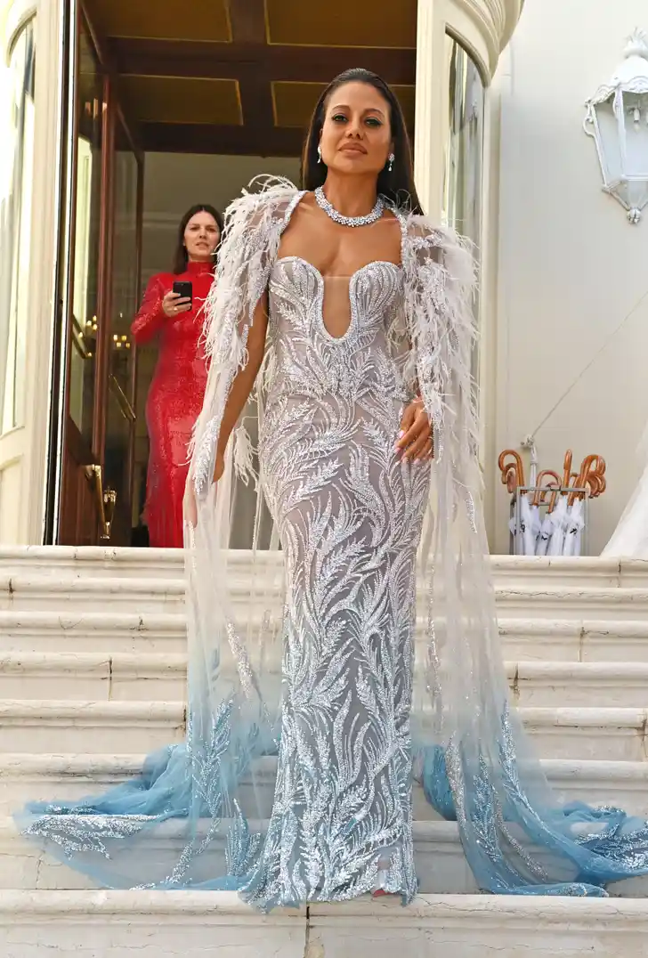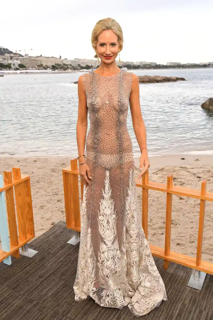 Emma Weymouth, de markiezin van Bath, dook tijdens het filmfestival van Cannes op in Hotel du Cap-Eden-Roc en droeg deze Tony Ward. Alles in het nette, het decolleté werd op haar plek gehouden met een stukje doorschijnende stof.