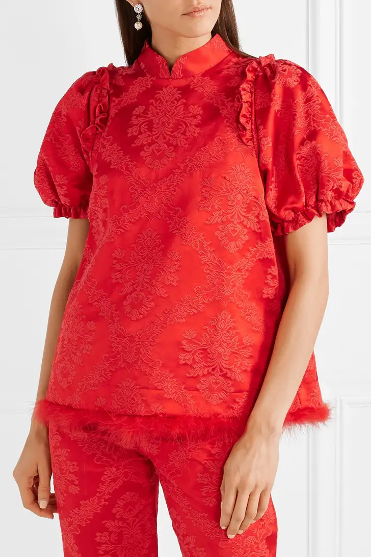 Simone Rocha's net veren afgezette top van rood brokaat (Net-a-porter € 468)