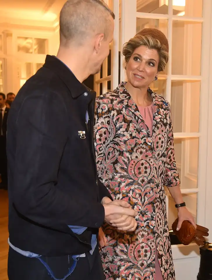 Staatsbezoek Frankrijk 2016, een jas in roze-zwart-beige brokaat.
