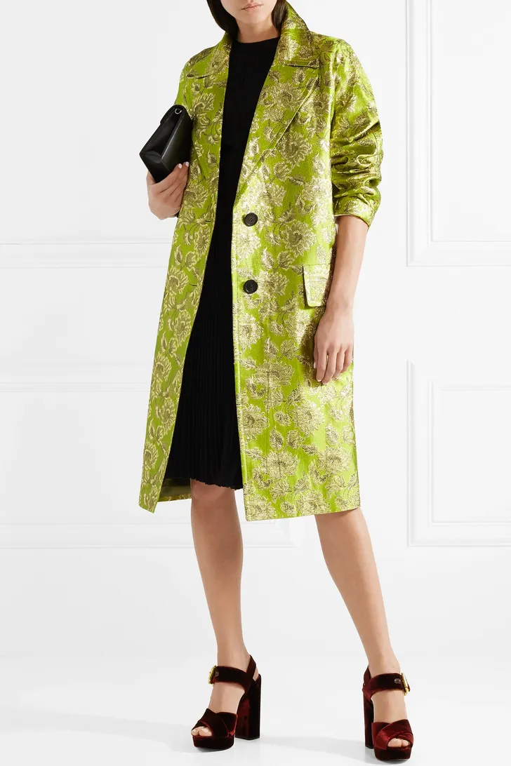 Mocht je de smaak te pakken hebben, deze jas van groen brokaat (Net-a-porter € 2200) is van Prada.