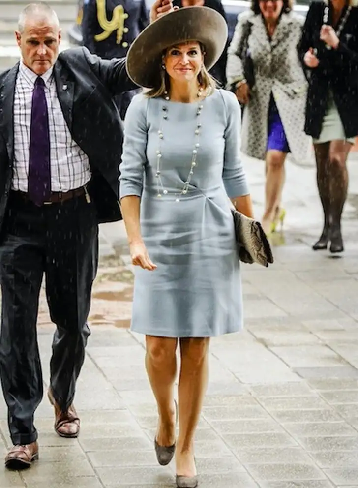 Vorig jaar was Máxima aanwezig in The Hague Institute for Global Justice en woonde ze de opening bij van een seminar over de bescherming van onderwijs in conflictsituaties. Daar droeg ze een blauwe japon met klokmouwen/trompetmouwen van de Londense designer Roksanda.
