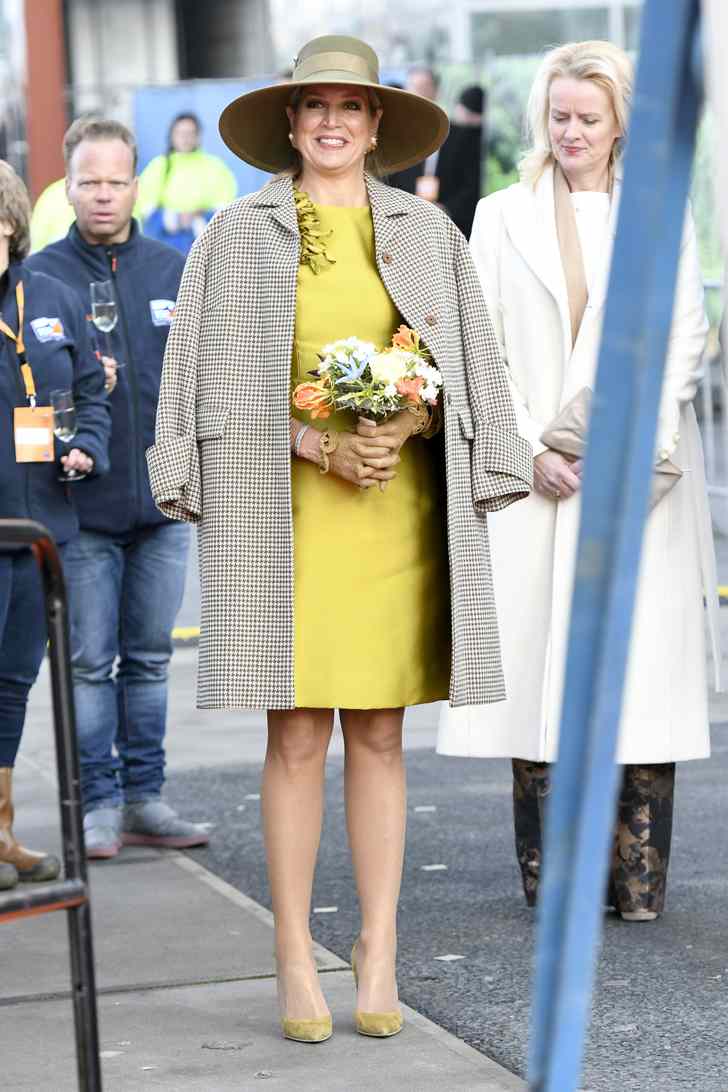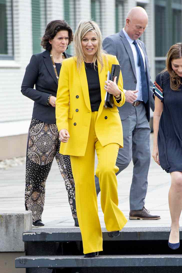 In 2018 verscheen Máxima in deze gele look voor de doop van de nieuwe sleephopperzuiger van Van Oord in Rotterdam. De sleephopperzuiger kreeg de naam Vox Amalia en werd dus – obviously – vernoemd naar de oudste dochter van de koningin.