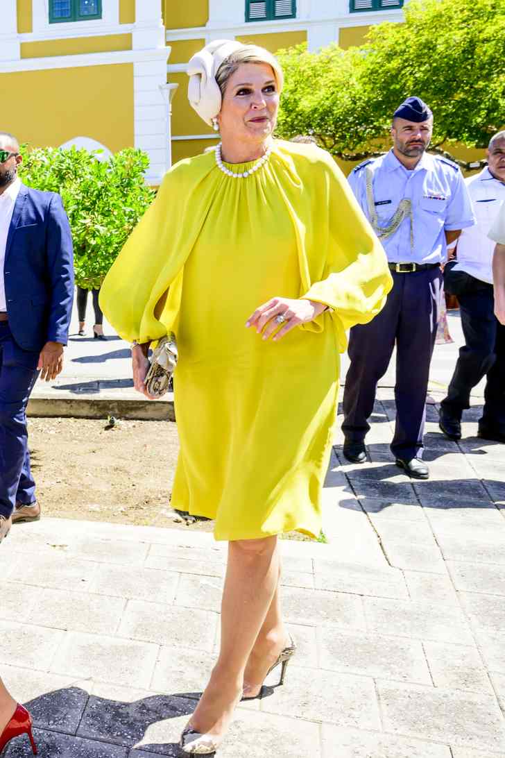 Een wat recentere look. Tijdens het koninklijke bezoek aan het Caribisch gebied in 2023 verscheen de koningin meerdere keren in vrolijke outfits, waaronder deze felgekleurde gele jurk van haar favoriete merk Natan.