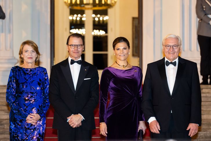 Kroonprinses Victoria van Zweden droeg een prachtige japon van Camila Thulin in paars fluweel en een opvallende ketting die de look helemaal compleet maakt. Een glittertje kan op zo'n bijzonder avond natuurlijk ook niet ontbreken. First Lady Elke Büdenbender heeft dit goed begrepen en droeg een schitterende blauwe jurk.