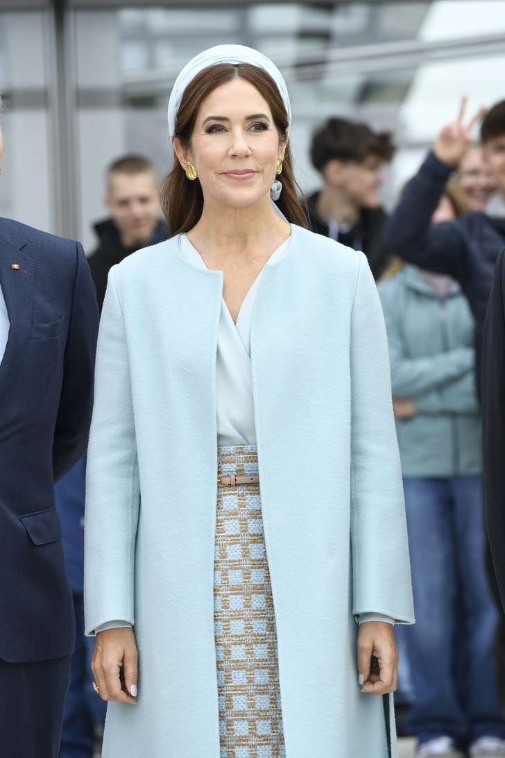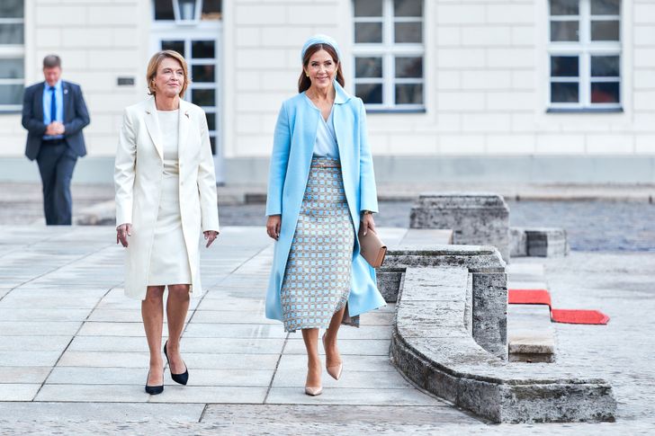 Goed, koning Frederik en koningin Mary zijn dus op bezoek in Duitsland. Koningin Mary droeg voor de aankomst in Berlijn een combinatie van lichtblauw en beige. De blouse is van Jesper Høvring, de geruite rok en jas zijn beide van Emilia Wickstead.