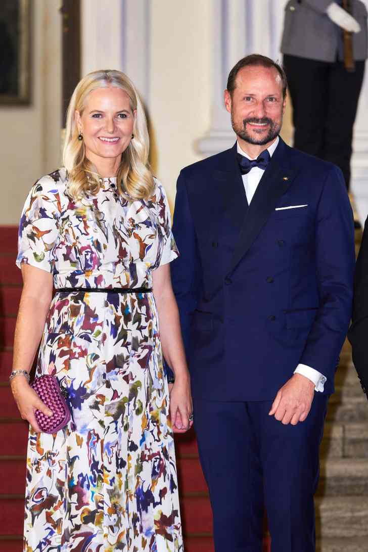 Kroonprins Haakon van Noorwegen en zijn vrouw Mette-Marit waren ook van de partij. Kroonprinses Mette-Marit herdroeg de kleurrijke Fall Winter Spring Summer-jurk die ze in 2016 ook al een keer droeg naar het banket voor de Nobelprijzen. Haar outfit combineerde ze met een paarse Bottega Veneta-clutch, een kleur die ook terugkomt in de jurk. De kroonprinses maakte de look af met diamanten oorbellen.