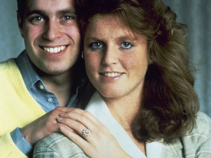 Andrew en Sarah kenden elkaar al sinds hun kindertijd en zagen elkaar regelmatig tijdens polowedstrijden. De vonk sloeg over in 1985 op Ascot. Andrew ontwierp zelf haar verlovingsring: het werd een Burmese robijn, als ode aan haar rode haar, omringd door tien druppelvormige diamanten.