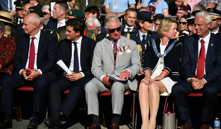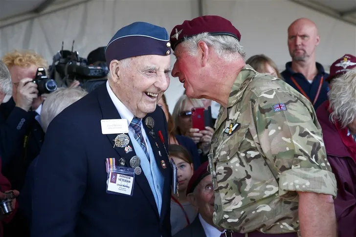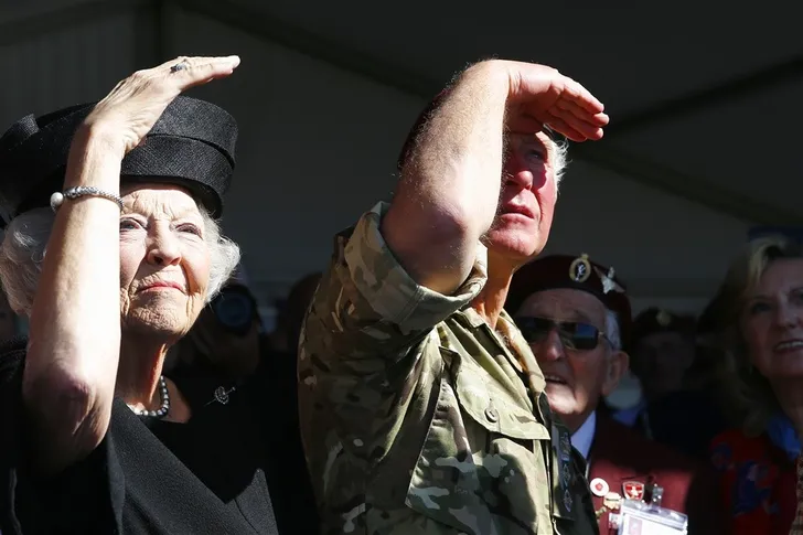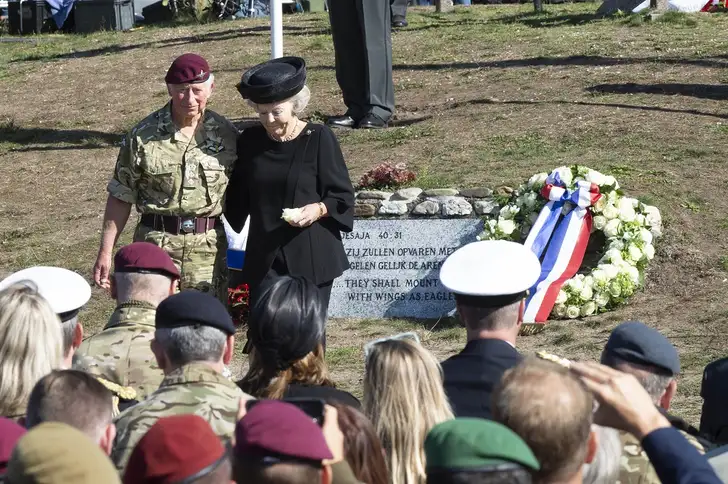 Beatrix, in stemmig zwart, was vandaag aanwezig bij de Airborne Luchtlandingen en Herdenking in het kader van 75 jaar Vrijheid. Ze kreeg gezelschap van Britse kroonprins Charles, in militair tenue.
