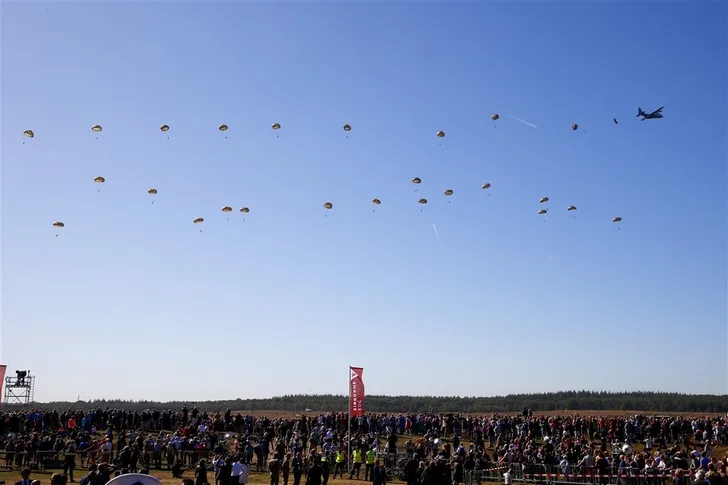 En samen zagen ze parachutisten neerdalen, zij het onder aanzienlijk betere omstandigheden als 75 jaar geleden.