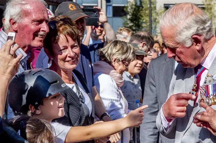 De kroonprins had een druk programma: Charles, inmiddels in een pak, opende ook nog de gerestaureerde toren van de Eusebiuskerk in Arnhem. Dat deed hij door een plaquette te onthullen en met een rondje langs het publiek, waarbij hij nog even zijn medailles toelichtte..