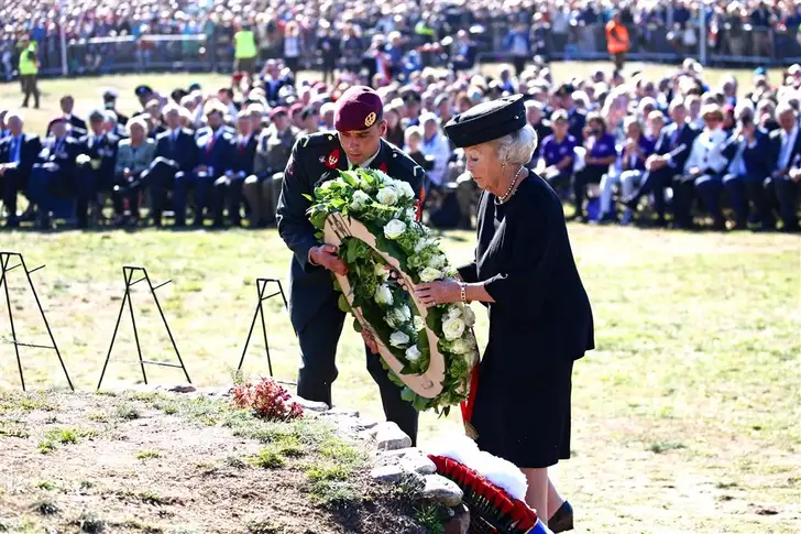 Prinses Beatrix en de prins van Wales woonden de herdenkingsbijeenkomst op de Ginkelse Heide bij...
