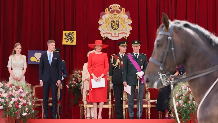 De Belgische koninklijke familie was goed vertegenwoordigd. Prinses Astrid en haar man Lorenz, prins Laurent en prinses Claire (in een megahoed) en prinses Delphine (in een vrolijke zelfontworpen print) en haar man Jim – de royal box was lekker gevuld.