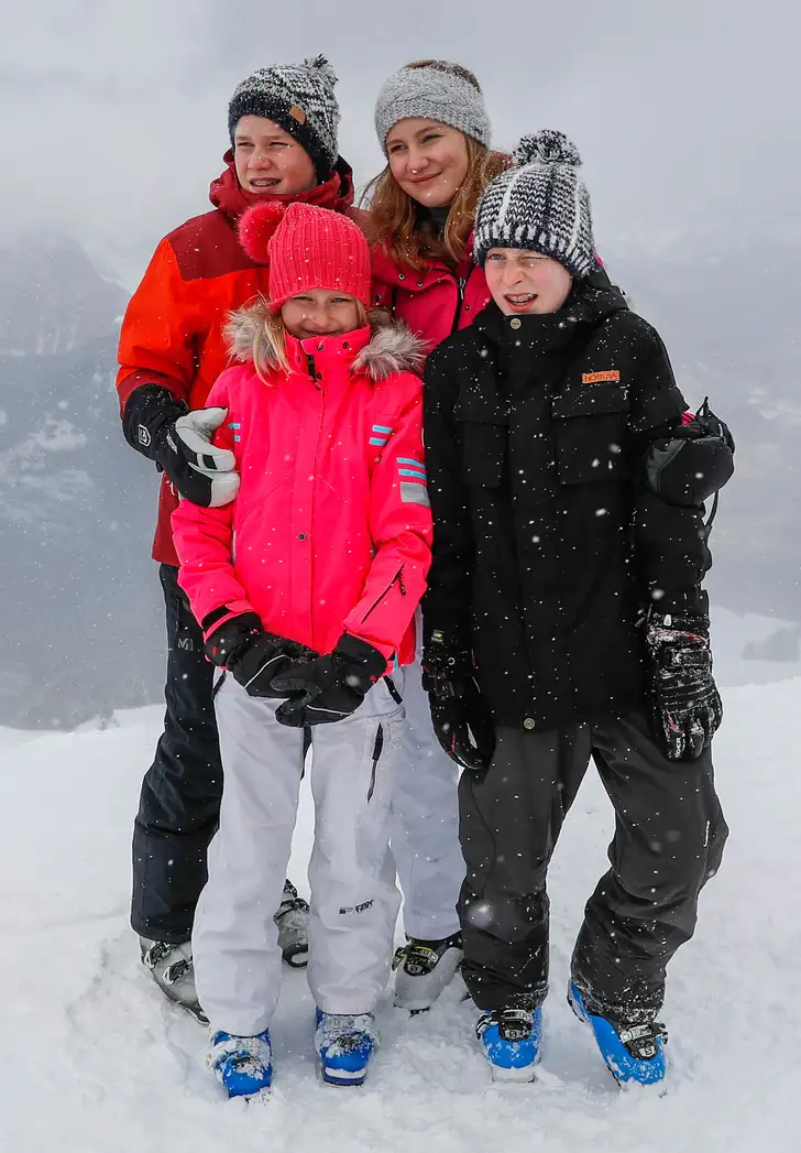 Koning Filip, koningin Mathilde en hun vier kinderen Elisabeth (16), Gabriël (14), Emmanuel (12) en Eléonore (9) genieten de komende dagen van de pistes van het Zwitserse luxeoord Verbier. Dat doen ze elk jaar, net als de Oranjes in Lech. Enige verschil: de Oranjes zitten altijd in een hotel (van vrienden, dat wel), terwijl de Belgische royals een chalet lenen van een bevriende baron. De plaatjes worden er niet anders van: hieronder zie je onze zuiderburen in actie.
