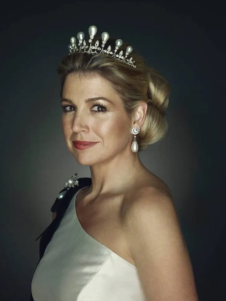 En natuurlijk het pronkstuk op haar hoofd: de antieke Anna Paulowna-pareltiara. Misschien wel het meest bekend als de tiara die Máxima droeg op het officiële portret voor haar veertigste verjaardag.