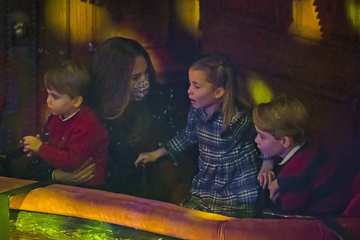 De hertog en hertogin van Cambridge besloten hun drie bloedjes op een avondje in kerstsfeer te trakteren. Het was voor prins George, prinses Charlotte en prins Louis het eerste officiële rode lopermomentje. Louis droeg een jasje van George #onsbinzûnig.