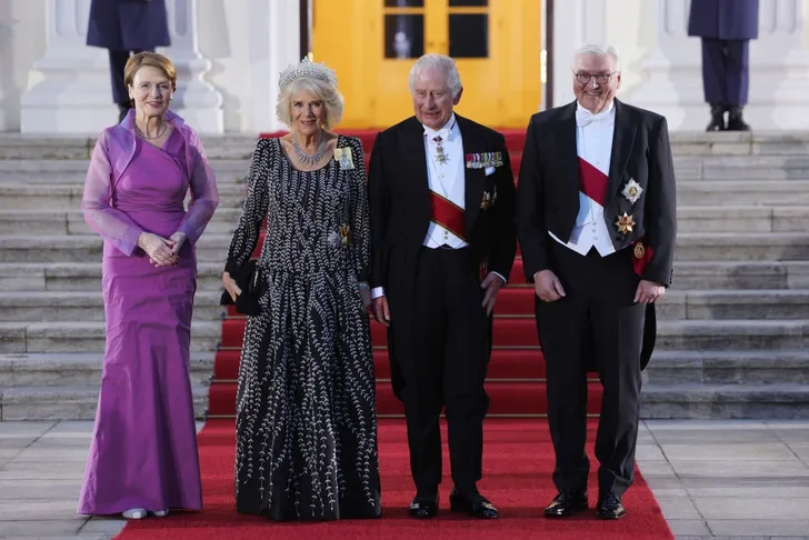 Het mocht de stemming in Berlijn niet drukken, het was een dag volgens het vertrouwde protocol van een staatsbezoek. En werd afgesloten met een diner in Slot Bellevue. Links in prachtig paars First Lady Elke Büdenbender, rechts de Duitse president Frank-Walter Steinmeier.