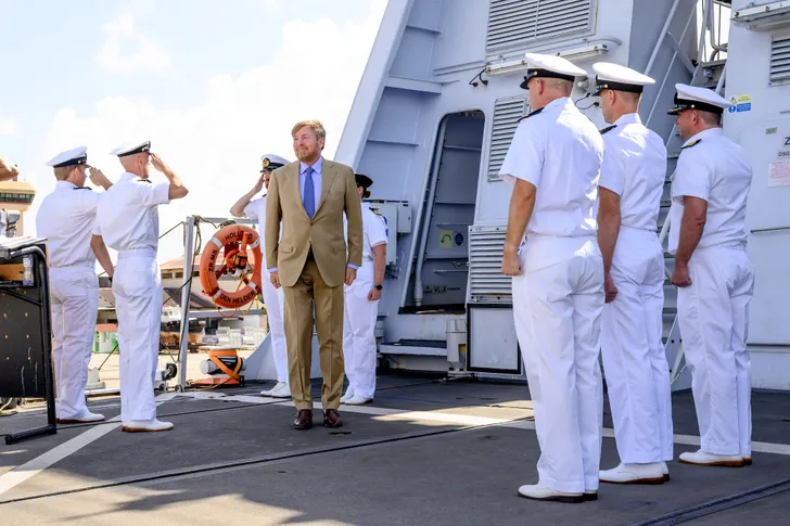 Amalia koos voor een marineblauwe look, maar wel een stukje vrouwelijker dan tijdens haar werkbezoek aan de marine vorig jaar (wel fijn met sneakers). En de koning, tja… dit leek ons nou echt een momentje voor het uniform dat hij mag dragen op momenten die hij zelf geschikt vindt.