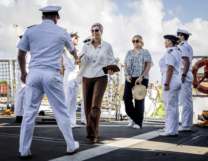 Máxima heeft natuurlijk ook menig Defensie-schip van binnen gezien en is een pro in roostertrappen navigeren op killer heels. Of op blokhakken, zoals vandaag, gecombineerd met een pantalon en een witte NATAN-blouse. Zeer zeewindgeschikt, zouden wij zeggen.