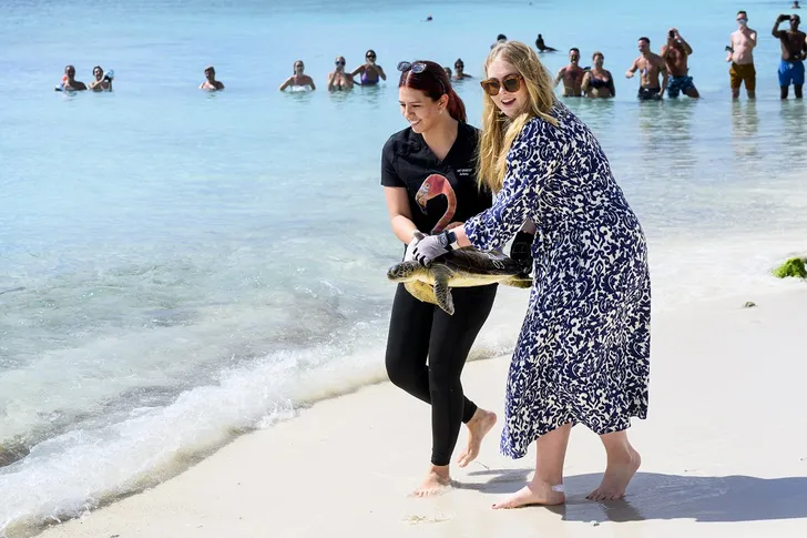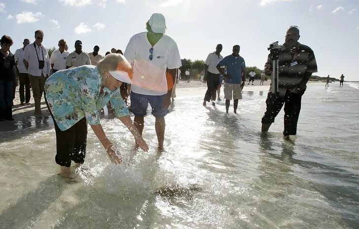 En dat is een leuke familietraditie: hier Amalia's oma Beatrix die haar schildpad Ariane doopte voor die werd losgelaten in de zee (in dit geval bij Bonaire).