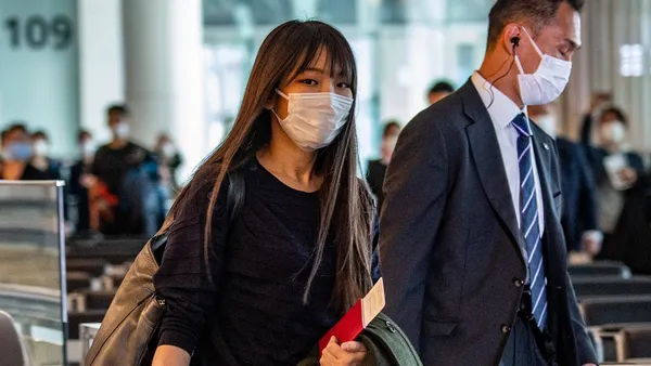 ... met haar man op Haneda Airport voor hun vlucht naar New York. Door hun huwelijk verloor ze haar titel. Het was een wat gespannen exit, met veel pers erbij.