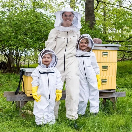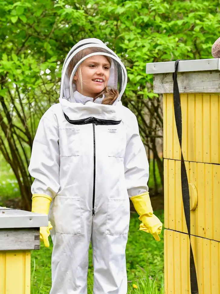Zo bezocht prinses Estelle (met haar broertje en haar moeder, kroonprinses Victoria) buitengewoon goed ingepakt de bijenkorven in de tuin van Paleis Haga.