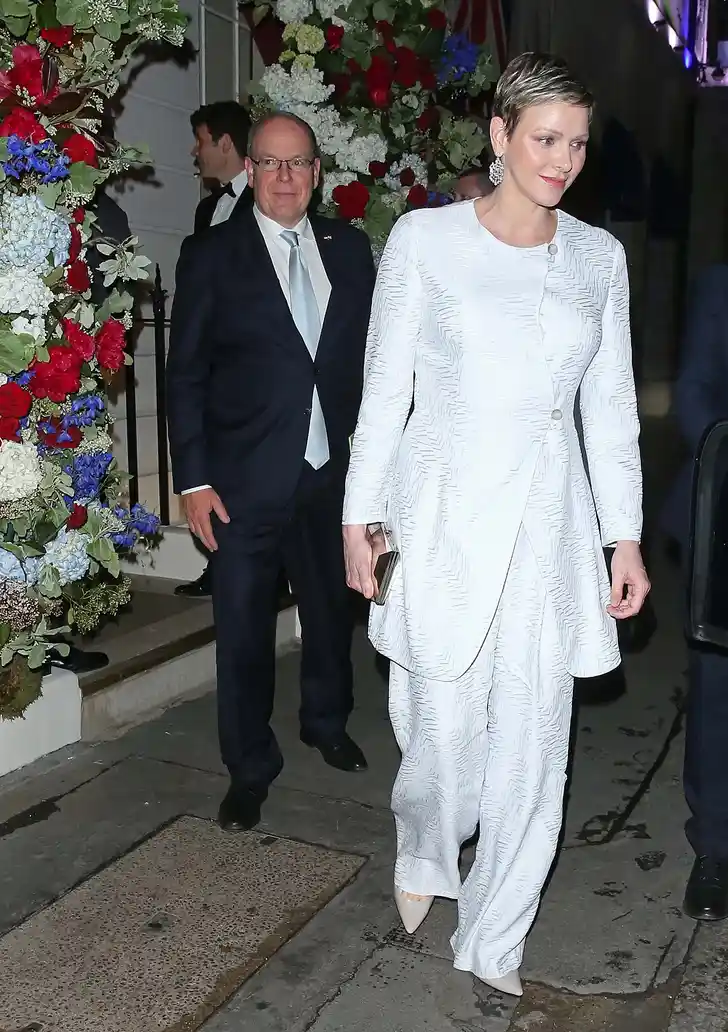 Voor het vrienden- en familiediner in Oswald's na de receptie droeg de prinses een wit pak van Armani met een froissé chevron motief dat het garen extra laat glanzen. Het strakke silhouet zie je haar vaker dragen, het zomerse wit doet ook denken aan zonnebrillen en de Côte d'Azur.