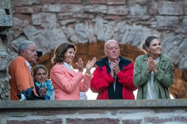 's Avonds hingen ze in de 'royal loge' van Kasteel Borgholm voor een concert van Laleh. Van links naar rechts Ralf Sommerlath (familie van koningin Silvia), prinses Madeleine, Silvia, een onbekende mijnheer en kroonprinses Victoria.