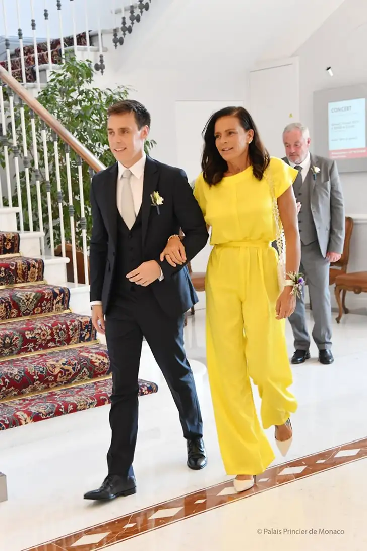 Prinses Stéphanie zag kans onder de radar te blijven in deze kanariegele jumpsuit die ze naar het burgerlijk huwelijk droeg.