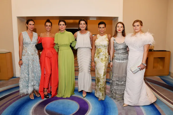 Daarvoor lieten de dames zich ook nog even op hun mooist vastleggen. Van links naar rechts Tatiana Santo Domingo (getrouwd met Caroline's oudste zoon Andrea), Pauline Ducruet (oudste dochter prinses Stéphanie, in Alexia Maria), Charlotte Casiraghi (oudste dochter prinses Caroline), prinses Stephanie die er echt stunning uitzag in Galvan London, prinses Alexandra van Hannover (jongste dochter van prinses Caroline) en Camille Gottlieb, de jongste dochter van prinses Stéphanie. Schitterend door afwezigheid: de bruid, prinses Charlene en Beatrice Borromeo, de ándere schoondochter van Caroline. A good time was had by all, we're sure.
