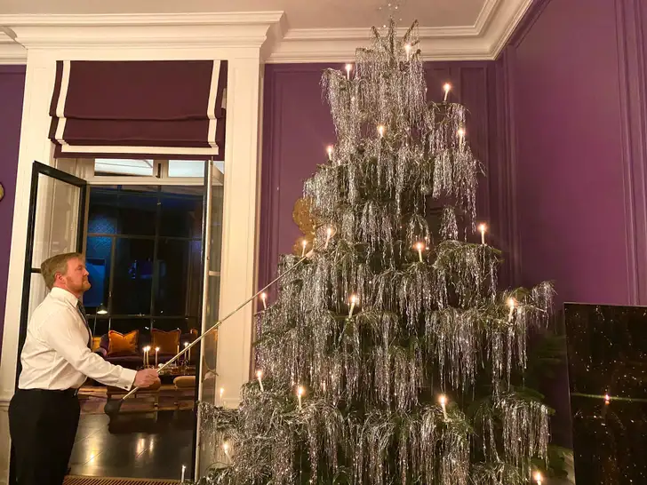 Binnen staat overigens nog geen boom. Bij het Koninklijk gezin is het traditie dat pas op kerstavond de kerstboom wordt opgetuigd en de kaarsjes worden aangestoken. De koning steekt hier een kaarsje aan in de boom van het gezin op Paleis Huis ten Bosch.