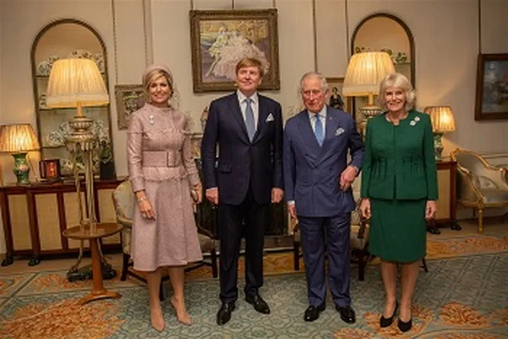 De Oranjes werden dinsdagochtend eerst verwelkomd door prins Charles en Camilla. Máxima draagt voor de dag een nieuwe mantel van Claes Iversen.