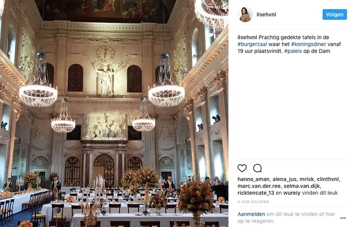 Wat een mooie tafels - en dito menu. Een overzicht in foto's, die onder andere gedeeld werden door het zeer populaire 'Queen Máxima' Instagram-account. Het Paleis op de Dam blijft na het diner 50 uur achtereen open; maar wel alleen voor de gelukkigen die een gratis toegangskaart hebben weten te bemachtigen.