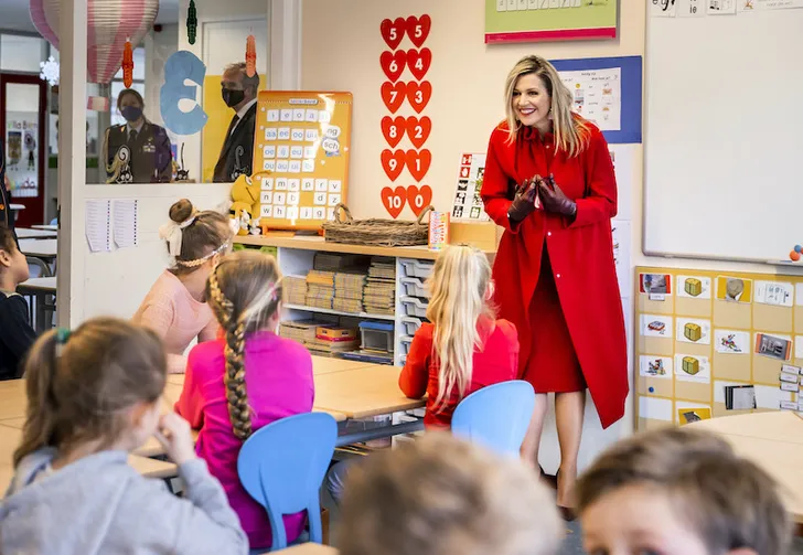 Voor het eerst sinds half december ging ze er op 18 februari weer op uit, naar een basisschool. En dat in deze vlammende look.