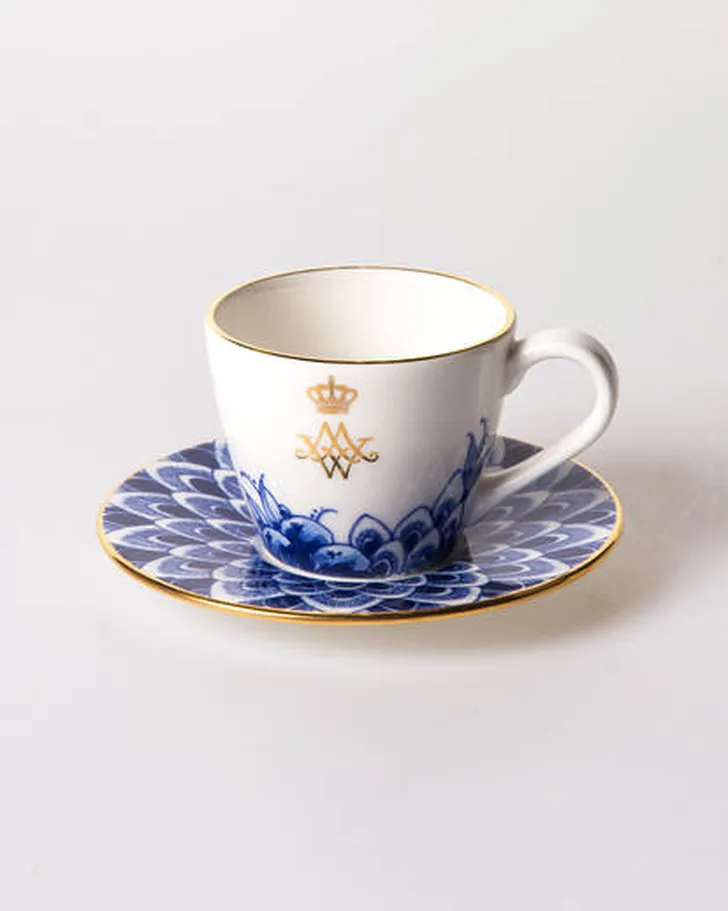 Het servies is genaamd ‘Blossom Panache’. Delfts Blauw wordt gekenmerkt door stillevens met gelaagde blauwschakeringen. In de compositie is de oranjebloesem in een speels gedrapeerd boeket verwerkt, waartussen de ijsvogel van tak naar tak vliegt. De ijsvogel verwijst naar de tekst die op de achterkant is aangebracht: 'Saevis tranquillus in undis'. Vrij vertaald: 'zich stevig staande houden in woelige baren'. Deze tekst was de lijfspreuk van Willem van Oranje en verwijst naar de woelige baren waar de ijsvogel zijn nest op bouwt.