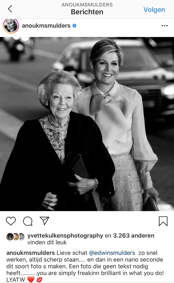 Royals fotograferen is een vak apart. Je weet nooit precies aan welke kant ze uitstappen, poseren is er niet bij en als je pech hebt, kijken ze niet eens even je kant op. Anouk Smulders, getrouwd met fotograaf Edwin Smulders, weet dat als geen ander. En jubelde dan ook terecht over een foto die Edwin gisteren van prinses Beatrix en koningin Máxima maakte.