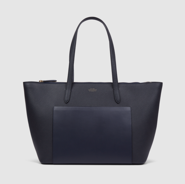 De donkerblauwe tas is breed, stevig en heeft een veilige ritssluiting bovenop. Ideaal voor een prinses die vaak onderweg is en niet elke minuut haar handen vrij heeft. Smythson is een van de oudste luxehuizen van Groot-Brittannië en erg geliefd bij royals en diplomaten.