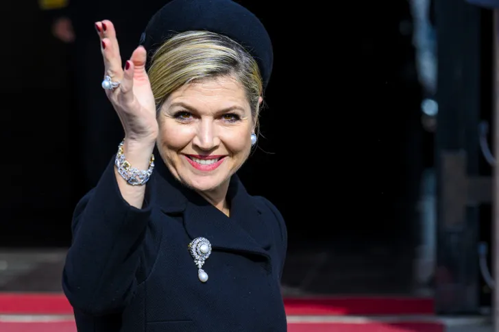 …maar Máxima trok er wél de nodige glimmers voor uit de juwelendoos. Parels in haar oren, een parel om haar vinger, parels op haar broche. En dat alles afgetopt met een paar diamanten armbanden. Moet kunnen om haar Jackie O. ensemble een beetje schwung te geven.