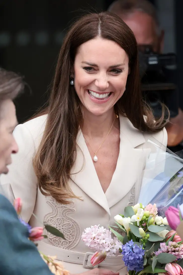Hertogin Kate droeg een op zich fraaie jurk (€ 475; het lijkt een pakje, maar is één geheel) van Self Portrait in havermout, ook bekend als De Saaiste Kleur Ooit. Het leek een respectvolle poging om de wat minder fashionable Anne niet te overschaduwen, wat lief en chic is, maar niets voor de beeldvorming deed.