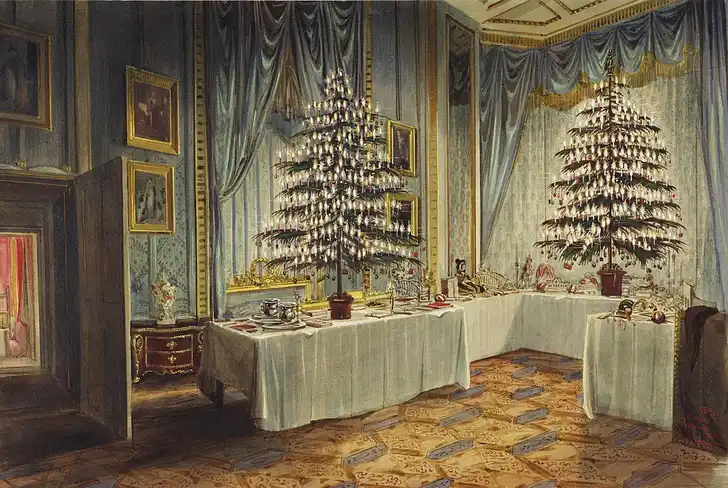 1848: de boom waar de kerstboomtraditie mee begon. Het was Duitse prins Albert die koningin Victoria enthousiast maakte voor een versierde boom. Het nieuwtje sloeg aan, sloeg over op heel Europa en elders en is nooit meer verdwenen.