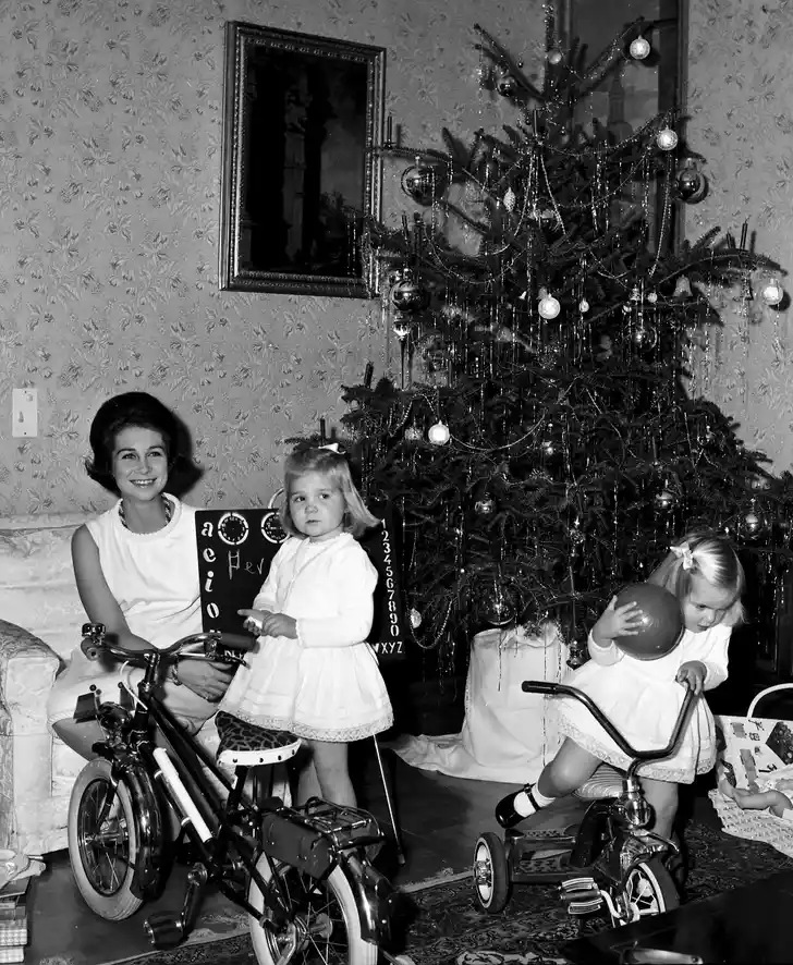 Paleis Zarzuela, 1967: prinses Sofia met haar dochters Elena en Cristina, die overduidelijk fietsjes onder de boom hebben gekregen.